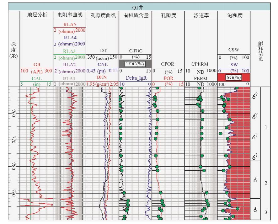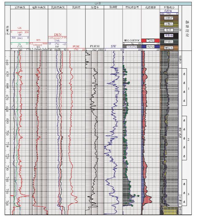 ![]() | 图 4 Q1井页岩气测井综合评价图 Fig. 4 Evaluation of gas shale well logging for Q1 |