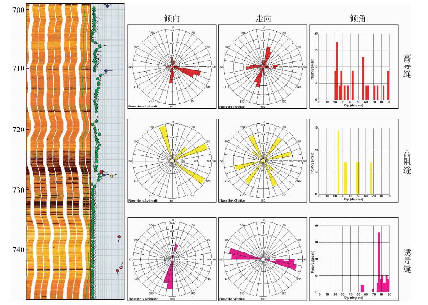 Q1井龙马溪组高导缝发育较少,共23条,倾向以南东东为主,走向北北东-南南西和近东西向,倾角20°~88°;高阻缝发育较少,共发现7条,倾向和走向均较分散,倾角24°~68°;解释出的诱导缝数量大于50条,倾向以南为主,走向近东西,倾角多大于75°.高导缝和高阻缝主要发育在龙马溪组和五峰组,相对发育段为725.0~727.0 m和738.0~742.0 m,如图 5所示.