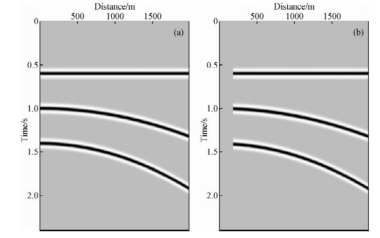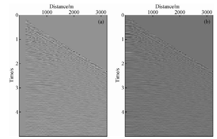 ![]() | 图 1 合成的单炮记录 (a)合成地震剖面;(b)近偏移距缺失10道的剖面. Fig. 1 Synthetic single shot record (a)Synthetic seismic section;(b)Seismic section with 10 traces missing at the near offset. |