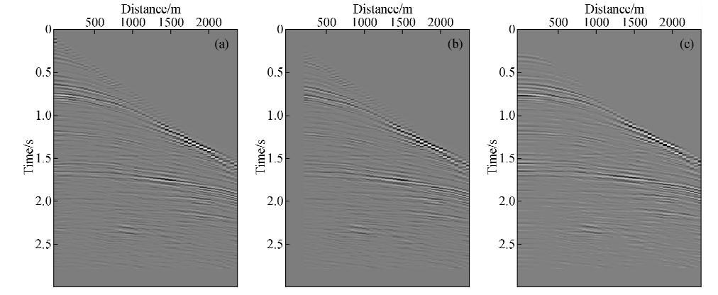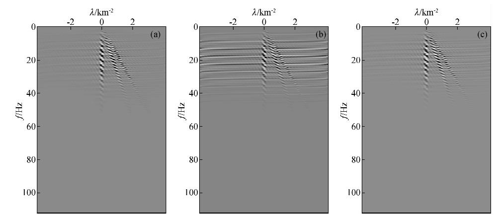 ![]() | 图 2 λ-f域抛物Radon变换与λ-f域加权抛物Radon变换效果对比 (a)图 1a所示数据的λ-f域抛物Radon正变换剖面;(b)图 1b所示数据的λ-f域抛物Radon正变换剖面; (c)对图 1b所示数据应用文中方法重建的变换域剖面(迭代一次). Fig. 2 Result comparison between λ-f l domain parabolic Radon transform and λ-f l domain weighted parabolic Radon transform (a)λ-f l domain parabolic Radon forward transform of data showed in Fig. 1a;(b)λ-f l domain parabolic Radon forward transform of data showed in Fig. 1b;(c)Transformed domain section of data reconstructed by the method proposed in this paper(one iteration). |