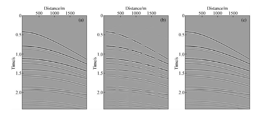 基于波动方程的表面多次波预测方法SRME(Surface-related multiple elimination)要求全波场数据,为此,数据重建的效果直接影响着地震资料多次波预测和压制的效果.为测试文中提出的λ-f域加权抛物Radon变换重建地震数据的效果,合成了含表面多次波的模型数据,如图 3a所示.完整的理论模型数据共100道,其道间距为20 m,采样间隔为4 ms.人为的从模型数据第1道、第20道、第40道、第60道、第80道开始各剔除5道数据,如图 3b所示.对其采用文中所述的λ-f域加权抛物Radon变换方法进行重建,共迭代4次,重建后的炮记录如图 3c所示,重建效果较为理想,同相轴自然连续.由此可见,该方法对含多次波的近、中、远偏移距数据重建均有较好的适应性.
