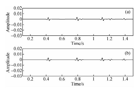 ![]() | 图 4 单道重建效果对比 (a)图 3a所示原始炮记录的第3道数据; (b)图 3c所示重建后炮记录的第3道数据. Fig. 4 Result comparison of single trace reconstruction (a)The third trace of original shot record showed in Fig. 3a; (b)The third trace of shot record after reconstruction showed in fig3c. |