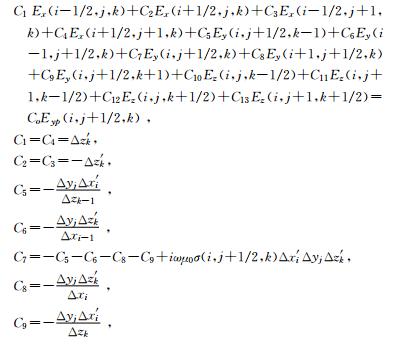 利用(8)式,按照图 1所示的有限差分方法,可得Maxwell方程组的离散结果(见附录).如若求得各个单元电场值,可以用插值的方法求得空间任意点电场,同时利用(3)式中的电场旋度方程可以求得任意点的磁场值.