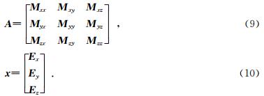 (9)式矩阵中各个子元 M ij(i,j=x,y)同样也是稀疏对称矩阵,其中 M xj为附录中求 x分量时的系数,M xy对应于 C6-9,M xz对应于 C10-13,而M xx对应于 C 1-5,其余两个分量按照此规则依次对应. x为欲求解场值,B 为和背景场相关的向量.由离散结果可知,对于这样的大型方程组的问题往往利用迭代法来求解,主要计算方法有基于Lanczos分解原理(Lanczos,1950; Paig,1976; Druskin and Knizhnerman, 1994)的双共轭梯度法和基于剩余模最小的Amoldi原理(Fujino and Zhang, 1996)最小残差方法.本文比较了两种方法各自具有代表性的迭代算法:带有稳定因子的双共轭梯度法BiCGStab2(St2)(张继锋等,1996;王志刚等,2006;张永杰和孙秦,2007)和拟最小残差法(QMR)(李欣和朱景福,2009).
