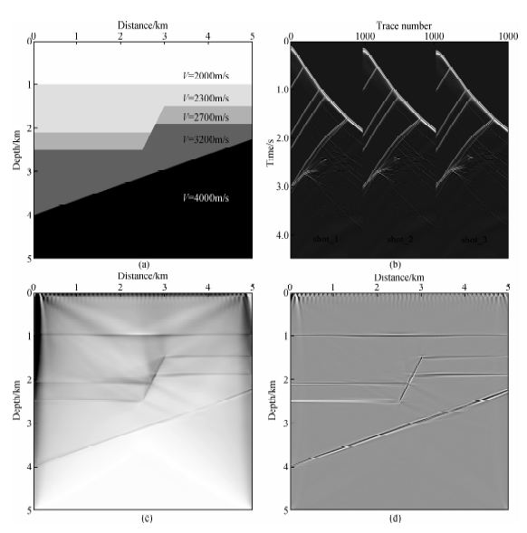 3.1 断层构造模型设计如图 4a所示断层地质体,模型网格大小为1000×1000,纵横向空间步长均为5 m,在地表距左端25 m和4975 m处分别布设两口观测井,1号井和2号井,从地下5 m开始,每口井沉放1000级检波器,检波器间距为5 m.炮点位于地表,从左端100 m处开始,炮间距100 m,共49炮,震源采用主频40 Hz的雷克子波,时间步长为0.4 ms,时间采样点数为11250.1号井第3到5炮的VSP记录如图 4b所示,全部VSP记录的逆时偏移结果如图 4c所示,低频噪声干扰严重,拉普拉斯方法去噪处理后的结果如图 4d所示,断层刻画清晰,高陡倾角构造准确成像.