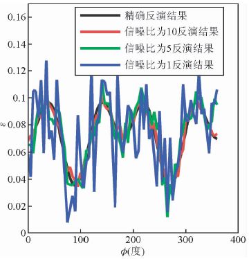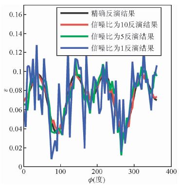 采用图 3所示的地震纵波速度,加入不同信噪比反演得到结果,根据公式9可以反演得到各向异性的反演结果,反演得到的各向异性参数如图 5图 6所示,其中图 5为ε随方位角的变化的反演结果,图 6为δ随方位角的变化的反演结果.其中黑线为精确反演结果,红线为信噪比为10的反演结果,绿线为信噪比为5的反演结果,蓝线为信噪比为1的反演结果,由图 5图 6知,信噪比较高反演结果较准确,信噪比较低反演结果与真实结果有一定的偏差.