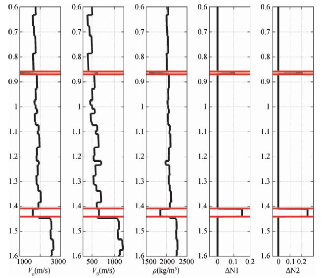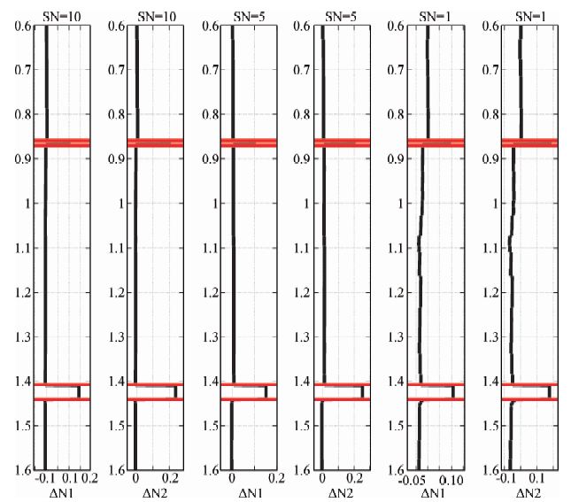 为了验证该方法的准确性,抽取Marmours模型中其中一道作为模型数据,如图 8所示.其中从左到右分别为纵波速度,横波速度,密度,裂缝1的法向柔量,裂缝2的切向柔量,纵轴为时间t.如图,模型中设置两个含裂缝的位置,如红线所在区域.利用雷克子波合成不同信噪比不同方位的地震记录,然后从地震记录出发,求取不同方位的动校正速度,然后根据上面方法反演裂缝法向柔量,裂缝法向柔量的反演结果结果如图 9所示,从左到右分别信噪比为10裂缝1的法向柔量,信噪比为10裂缝2的法向柔量,信噪比为5裂缝1的法向柔量,信噪比为5裂缝2的法向柔量,信噪比为1裂缝1的法向柔量,信噪比为1裂缝2的法向柔量.由图 9知不同信噪比反演裂缝密度的位置都正确,但是当信噪比较低时,反演得到的裂缝法向柔量不准确,信噪比等于1时得到的裂缝密度反演结果与已知裂缝密度差别较大因此实际反演中应用信噪比较高的地震数据.