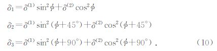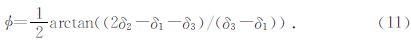 公式10中有3个未知数分别为δ(1),δ(2),Φ,根据公式10中三个一次方程可以求得裂缝方位角参数如公式11所示.