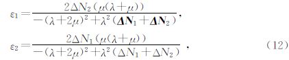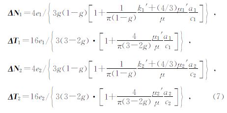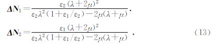 1 两组垂直裂缝等效为正交各向异性介质根据(Bakulin et al., 2000a,b,c)提出的裂缝等效公式,位于各向同性介质两组垂直裂缝等效为正交各向异性介质,裂缝介质的弹性矩阵分解为背景介质的弹性矩阵与裂缝介质的弹性矩阵,背景介质的弹性矩阵如公式1所示,裂缝1裂缝2的柔度矩阵如公式2公式3所示.其中 C b为背景介质的弹性矩阵,S f1为裂缝1的柔度矩阵,S f2为裂缝2的柔度矩阵,λ,μ为拉梅常数,ΔN1,ΔN2分别为裂缝1,2的法向柔量,ΔT1,ΔT 2分别为裂缝1,2的切向柔量.