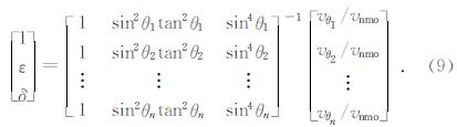 3 P波速度及各向异性参数反演地球物理反问题大多是非线性的,地层多参数反演容易出现多解性和局部最优的问题,本文采用最小二乘方法反演裂缝方位角与各向异性参数.反演公式如公式9所示:速度可以根据动校正求出.为了验证方法的正确性与抗噪性,分别加入信噪比为10,信噪比为5信噪比为1的噪音.