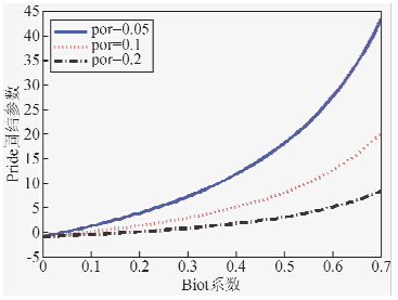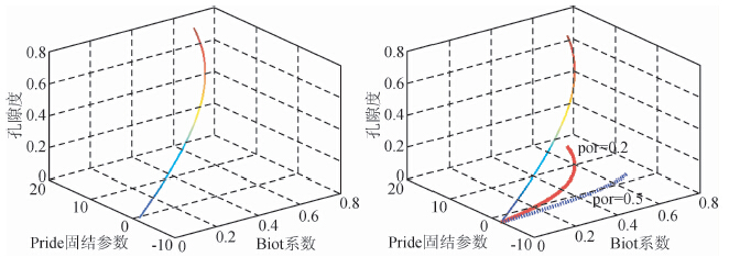 ![]() | 图 2 Pride固结参数、Biot系数、孔隙度三参数变化关系 Fig. 2 The relation among Biot coefficients,Pride’ consolidation parameters and porosity |