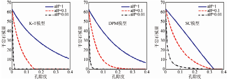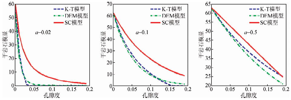从干岩石模量随孔隙形状的变化趋势来看,孔隙纵横比越大,越接近于球形,岩石骨架越硬,干岩石模量值越大.孔隙形状对干岩石模量影响很大,随着孔隙度增加,裂缝形孔隙的干岩石模量剧烈降低.随着油气田勘探开发的深入,当前研究的储层都是低孔低渗储层,当孔隙度比较低时,孔隙纵横比的选择显得至关重要,可以对比三种模型在同一孔隙纵横比条件下,对孔隙度变化的反映(如图 3).