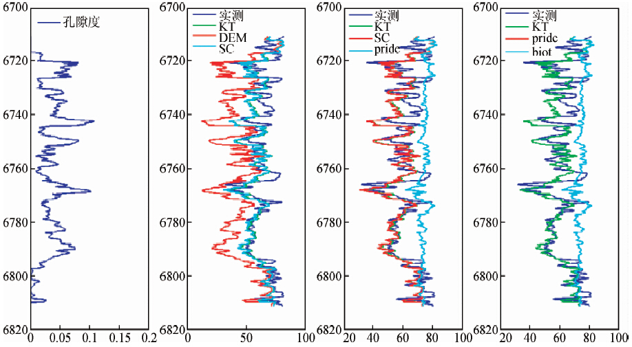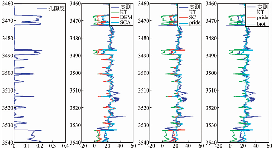 (2)在碳酸盐岩地层,单参数法显现出它的明显的不足,曲线形状和数值大小都与实际测量值偏离很大,而等效介质模型得到的结果比较合理,其中K-T模型和SC模型得到的结果要好于DEM模型得到的结果.