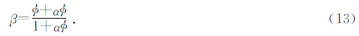 2 模型试验 2.1 三参数间关系由第二部分可知,单参数确定干岩石模量的方法,相当于只有两种,Biot系数法和Pride固结参数法,将这两种模型建立关系,可以对比这两个参数随孔隙度的变化关系,因为Biot系数定义为β=1-Kdry/Kma,所以,取β在0~0.7之间变化,孔隙度也取对应的变化区间,根据我们前面得到的关系β= +α 1+α,建立这三个参数之间关系式.