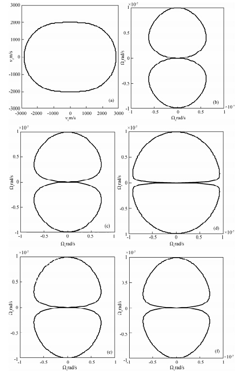 图 2 TI介质qSV波最大旋转速度及相速度 (a)为模型2中qSV波相速度;(b)为模型1中qSV波最大旋转速度;(c)为模型2中qSV波最大旋转速度;(d)为模型3中qSV波最大旋转速度;(e)为模型4中qSV波最大旋转速度;(f)为模型5中SV波最大旋转速度. Fig. 2 The maximum peak rotational rate and phase velocity of qSV wave in TI media (a)The phase velocity of qSV wave in the second model;(b)The maximum peak rotational rate of qSV wave in the first model;(c)The maximum peak rotational rate of qSV wave in the second model;(d)The maximum peak rotational rate of qSV wave in the third model;(e)The maximum peak rotational rate of qSV wave in the forth model;(f)The maximum peak rotational rate of qSV wave in the fifth model. |