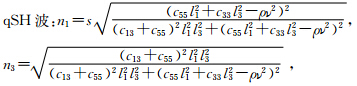 中方位角φ=0,则l1=sinθ、l3=cosθ、l2=0、n2=0, 故只需求出n1、n3即可,由方程(6)、式(9)与关系式 n1 n3 = u1 u3 及方向余弦关系n12+n32=1可得qP波、qSV波及qSH波在TI介质中偏振方向余弦n1、n3分别为