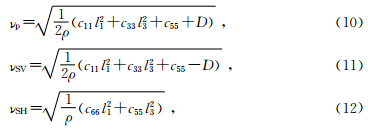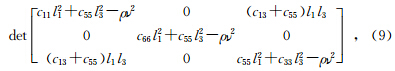 要使TI介质的Kelvin-Christoffel方程(6)有非零解,由本征值问题求解可知,其系数行列式为零,将式(7)代入方程(6),根据TI介质弹性系数矩阵中元素之间的关系及在xoz面l2=0可得