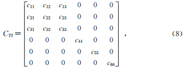 为了理论研究和实际应用的方便性,Thomsen在弱各向异性介质中根据波传播的相速度公式与广义胡克定律提出了一系列表征各向异性介质弹性性质的参数,包括P波和S波各自沿垂直方向传播的相速度α0和β0,及三个表示各向异性强度的无量纲系数ε,γ,δ(δ*),称为Thomsen参数.Thomsen参数能更加清楚方便地表示弹性介质的特征,故找出Thomsen参数与旋转速度的关系能更直观地看出旋转运动在不同介质中的变化.TI介质的弹性系数矩阵元素的Thomsen系数表征如下: