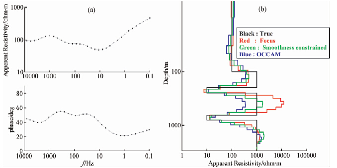 (a)原始视电阻率相位曲线图;(b)反演结果图;其中:Focus Rms=0.059;Smoothness constrained least-squares Rms=0.048;OCCAM Rms=0.061. Fig. 1 The inversion results of 1D model with six lays(a)Apparent resistivity and phase curves;(b)Resistivity curves of inversion results; Focus Rms=0.059;Smoothness constrained least-squares Rms=0.048;OCCAM Rms=0.061. |