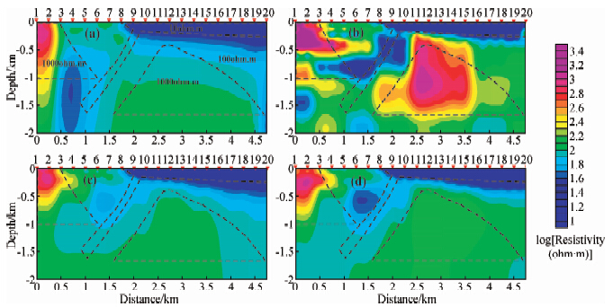 由图 2可以看出,四种反演方法(RRI、Smoothness constrained least-squares、OCCAM、Focus)都能较好还原理论模型的轮廓,其共同特征都为对低阻体的反应灵敏度大于高阻体(这也是MT方法本身的特点),在电性异常的边界部位,低阻体有所扩大,对高阻体的反应能力显的不足.所不同的是Smoothness constrained least-squares反演结果的电性体边界部位更为清晰,且对高阻体的反映更突出一些,但同时也出现多余的构造;而OCCAM和Focus则表现得较好;RRI方法对倾斜低阻体反映为近似直立的低阻体,它对剖面东向中深部高阻反映则与OCCAM、Foucs类似都表现不足.