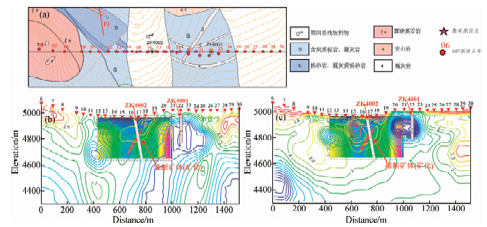 (a)测点地质底图;(b)等值线为RRI反演;(c)等值线为Smoothness constraine least-squares反演;其中颜色填充底图为激电测量反演结果. Fig. 3 The example of inversion results with observation data(a)geological map of observation posts; b、c:The fill map is polarization sounding inversion results,and the contours is MT 2D inversion results;(b)RRI inversion;(c)Smoothness constrained least-squares inversion. |