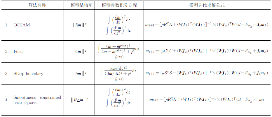 将(2)(3)(4)式代入(1)式,并根据函数的极值条件,求目标函数 φ(m,μ)关于模型向量m或m T的偏导数,并令其等于零,可得不同反演算法第k次迭代模型的求解公式.假设实测数据误差相互独立,则:Wd=diag{1/σ1,1/σ2,…,1/σN}.不同的反演算法其模型约束项 W m或模型结构项φmod的表现形式不同.方便起见,令Wd=W,并定义R为模型光滑矩阵,C为模型聚焦矩阵,S为尖锐边界矩阵,其具体的定义形式及模型迭代求解公式见下表 1.