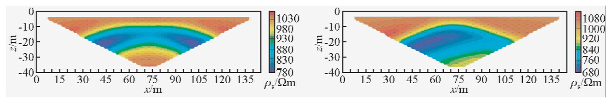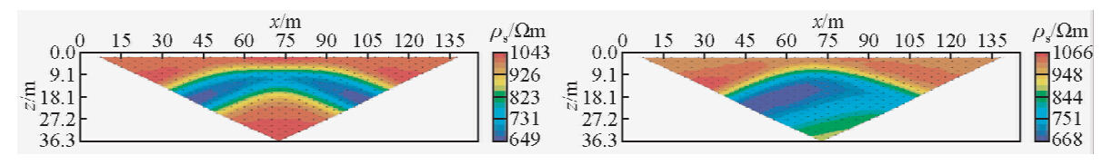 模型2: 如图 5所示二维低阻模型,图 6a为总场算法的二极装置视电阻率拟断面图,图 6b为异常场算法的视电阻率拟断面图.