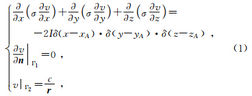在电阻率法中,点电源场是三维的,三维电场满足如下的Possion边值问题(潘克家等, 2012,万乐,2000):