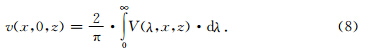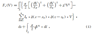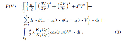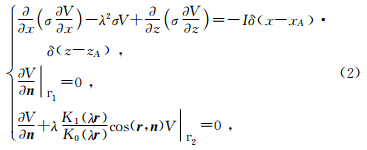 为电位v(x,y,z)的余弦傅立叶变换,λ为波数,K0与K1分别为零阶与一阶修正贝塞尔函数. 有限单元法求解偏微分方程,首先要将偏微分方程边值问题转化为对应的变分问题,与上式(2)对应的变分问题为