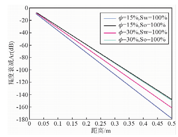 ![]() | 图 5 300 MHz石灰岩两种孔隙度下饱含水和石油时最大衰减和距离的关系 Fig. 5 The relationship between peak attenuation and distance in limestone of two kinds of porosity saturated with water or oil under 300 MHz |