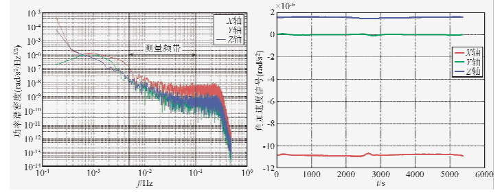 ![]() | 图 3 卫星三轴角加速度在轨实测数据(a)功率谱密度(b)时域值 GOCE L1b数据“EGG_CGA_1i”,2009年11月1日00:49:15~02:18:59,数据长度:5384 s.Fig. 3 In-orbit data of satellite three axes angular accelerations(a)PSD(b)data from time-domain GOCE L1b data“EGG_CGA_1i”from 00:49:15 to 02:18:59,November 1st, 2009,data length: 5384 s. |