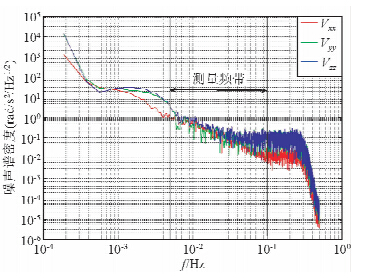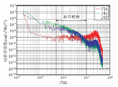 加速度计垂直于所在基线方向的差模信号ad,in,ij(f)主要取决于卫星的角加速度ω(ESA,2000;Rummel et al., 2011;Sechi et al., 2011),即ad,in,ij(f)/li≈ω k(f),其中下标k示三维正交空间(i、j、k)中与i、j相互垂直的第三轴,且与i、j按顺序符合右手螺旋法则.卫星三轴的角加速度数据可从GOCE在轨实测的L1b数据中提取(ESA,2006),将该数据在频域里进行功率谱密度分析可知,在5~100 mHz的测量频带内,姿控系统可将卫星三轴角加速度的功率谱密度控制在1×10-7 rad/s2/Hz1/2以下,如图 3a所示.若要求在测量频带内共模安装重合度系数的标定误差引入的梯度测量噪声小于1 mE/Hz1/2,则共模安装重合度系数的标定精度σθc需达到10-5 rad.加速度计垂直于所在基线方向的共模信号ac,in,ij(f)征卫星受到的大气阻尼等非保守力,即ad,in,ij(f)≈Fng,j(f)/msc,根据GOCE在轨实测L1b数据(ESA,2006),在250 km的轨道高度处,非保守力引入卫星三轴的共模加速度信号谱ac,in(f)在5~100 mHz的测量频带内小于1×10-7 m/s2/Hz1/2,如图 4所示.此时若要求在测量频带内差模安装重合度系数的标定误差引入的梯度测量噪声小于1 mE/Hz1/2,则差模安装重合度系数的标定精度σθd需做到5×10-6 rad.