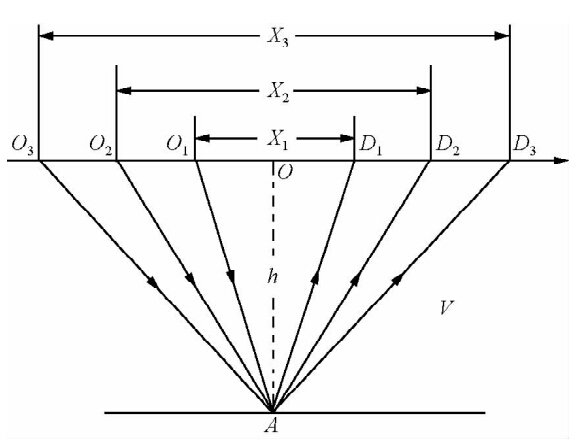 如图 2,从不同的反射点O3、O2、O1发射地震波,经过共同的发射点A发射,在相应的对称点D3、D2、D1接收地震波.其反射波的走时曲线方程为
