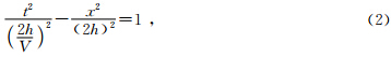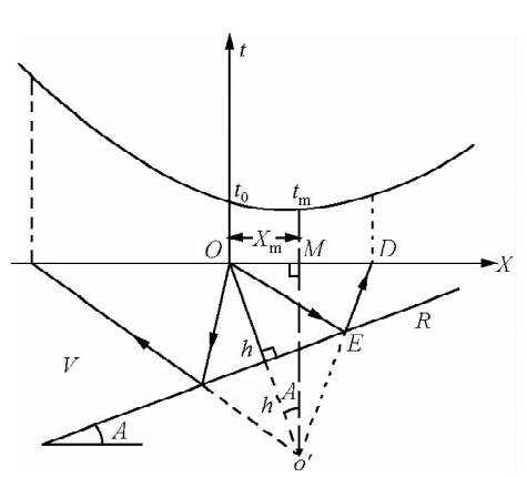 如图 1,在地面下深度为h处有一反射界面R,界面上覆盖层的波速为V.在O点激发的地震波传播到界面R后,部分能量反射回地面,在地面的D1、D2等点接收到反射波.O点发出的地震波可以认为是从镜面对称点O’点发出,于是可以得出反射波的走时曲线方程为(陆基孟,2001):