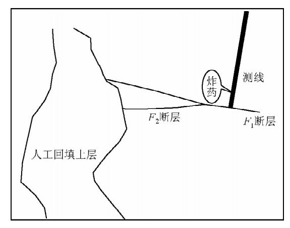 取北川-映秀大断裂中的陈家坪-白云山大断层,如图 4.图中的F1断层走向近东西,倾向几乎正北,经坑探测得该 断层倾角57.3°. 测线布置方向与断层F1垂直,炸药震源布置在侧线的南端,以该断层面作为反射面测量上盘地震波的速度.