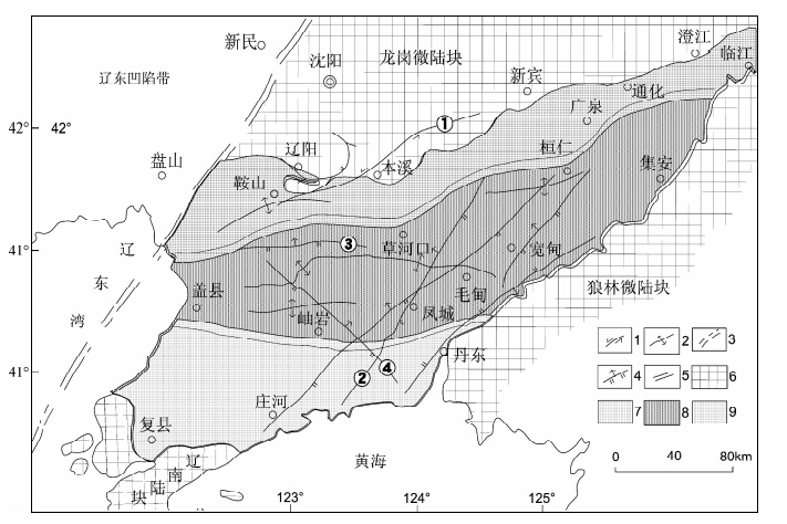 ![]() | 图 1 研究区大地构造与位置图 1 —走滑断层;2—吕梁旋回主要褶皱构造;3—郯炉断裂;4—逆断层;5—构造分区边界;6—太古宙古陆;7—北缘斜坡;8—中央凹陷;9—南缘浅台①寒岭-偏岭断裂;②刘家河-青堆子断裂;③海城-岫岩断裂;④海城-草河口断裂. Fig. 1 The tectonic structure and location map of the study area 1—structure partition boundaries;2—luliang cycle mainly fold structure;3—Tanlu fault; 4—fault; 5—klippe structure; 6—archean continental;7—Northern Slope;8—central sag; 9—the south rim shallow platform①Pianling-Hanling fault; ②Liujiahe-Qingduizi fault; ③Haicheng-Xiuyan fault; ④Haicheng-caohekou fault. |