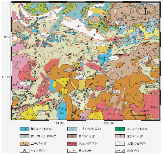 辽吉古裂谷是龙岗地块和狼林地块的拼合区域(胡国巍,1992),经历了多期构造叠加和岩浆活动,地质结构复杂,该区也是我国主要的古元古成矿带,赋存许多大型、超大型矿床(冯本智等,1998),许多学者在该区开展了大量的研究工作.张秋生、邹祖荣等系统论述了太古宙由与早远古宙层状岩系和岩体特征(张秋生,1988);陈荣度、李显东等对古元古代沉积盆地的构造属性、古元古界的层序与划分和南北古陆存在差异问题进行了深入的研究和探讨(陈荣度等,2003);刘俊来等通过对辽河群褶皱样式的研究,提出古元古界是一套处于伸展环境下裂谷堆积物组合(刘俊来等,2002);李三忠、杨振升等以同位素年代学制约,将元古代时期辽吉古裂谷深部动力学过程划分为造山前伸展、造山期的挤压、造山后的伸展塌陷三个阶段(李三忠等,1998);赵俊猛、卢造勋等以地震勘测建立了海城-岫岩一带的速度结构,并推测了该区的地幔起伏情况(赵俊猛和卢造勋,1998).前人多从地表的岩石类、地球化学角度进行研究的,而区域性深部地球物理资料相对匮乏,使得对该区深部地质结构以及区域构造演化的研究缺乏有力证据.以天然电磁场为场源的大地电磁测深法具有丰富的频谱成分,不受高阻层屏蔽影响,可以实现对地下深部电性结构进行深度探测,而横向分辨率较高的重磁法勘探对电法所获得的深部电性结构剖面的定性具有重要的约束作用,所以应用重磁电非震方法进行勘探可以更为准确的获得地下深部三维地质结构(王耀辉等,2013).为建立辽吉古裂古深部三维地质结构,设计并完成4条重、磁、电综合剖面,同时沿着上述非震地球物理剖面采集并测量了研究区内主要地质体物性.本文在充分收集和详细分析前人对于该区构造、地层等研究成果基础之上结合物性特征,对模拟和反演所获得的4条非震地球物理剖面进行综合地质-地球物理解译工作,为进一步矿产勘查和深入研究辽吉古裂谷形成机制及矿产预测提供重要的科学依据.