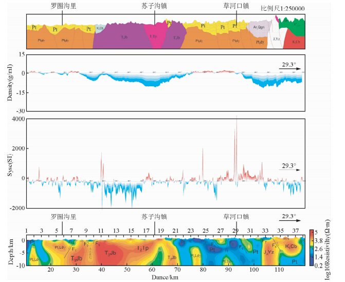 ![]() | 图 3 Line2线重磁电综合解译成果图 自上而下分别为:地质图切剖面、布格重力异常剖面、磁测ΔT剖面图、电法综合解释图. Fig. 3 Line2 results figure line of gravity magnetic electric method results From top to bottom are: Geological map cut section,Bouguer gravity anomaly section,Magnetic survey ΔTsection,Electrical method integrated interpretation chart. |