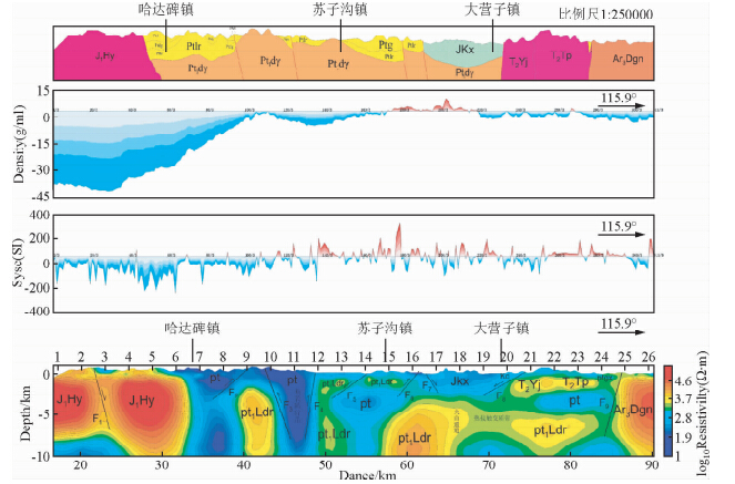 24~26号点,地表出露高阻、高密度、正磁异常新太古代大苏河片麻杂岩(Ar3Dgn),与领近古元古地层为断层接触关系,该断层即为北东走向的刘家河-青堆子断裂,依据电性结构剖面判断该断层倾向为西北向,倾角约为70°,断裂深切达数千米,这可能与辽吉裂谷挤压造山改造阶段有直接关系.