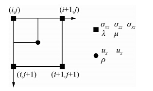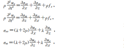 本文使用旋转交错网格有限差分法求解2维(x,z)平面中的位移—应力弹性波动方程组(x为水平方向,z为垂直方向),该方程组可以表示如下(Saenger et al., 2000):