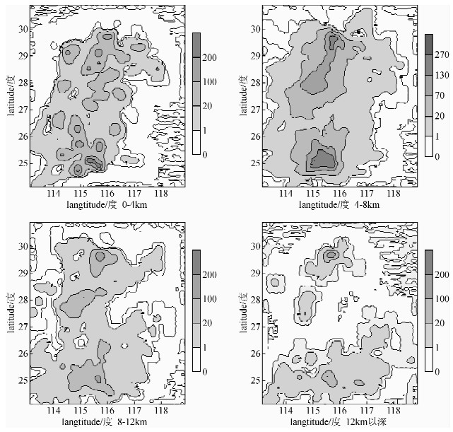 从图 3可以看出,网格单元射线穿透次密度分布不均,横向和纵向都有很大的差距,射线最密集的地方是第二层赣南地区和北部的南昌盆地附近,以这两区域为中心向周围扩展,形成包括大部分江西地区在内的覆盖区域,对比各层的状况可以看出,处于第一层和第二层射线密度覆盖范围最大,到第三层,随着深度的增加,射线范围缩小,射线穿透次数也急剧下降,最后分为赣南和赣北两个区域.
