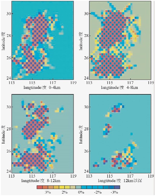 3.2 检测板测试检测板测试方法:在模型空间设置正负相间的速度扰动值,相隔五个像元设置一个扰动值,并以此点为中心,周围两层以内都与此点的速度扰动值相同,正负也相同,本文采用正负相间3%的扰动值,形成国际象棋棋盘一样的正负相间的方格,以此作为模型速度结构,并求其走时,利用阻尼最小二乘法反演后得到结果与其对比.本文反演中,采用的模型在水平尺度上使用格点间距0.2°×0.2°,垂直间距为4 km,反演结果如图 4.从图中可以看出,反演后的速度扰动和刚开始设置的检测板正负相同,浅部区域有较好的分辨率,因为所用的地震资料多为近震数据,在地表的射线覆盖比较密集,所以分辨率比较好,但是该区域由于受到地震台站的限制,只能限于江西境内,边缘区域分辨率较差.随着深度的增加,地震事件有减少的趋势,分辨率随之降低,且越是边缘地区分辨率越差.