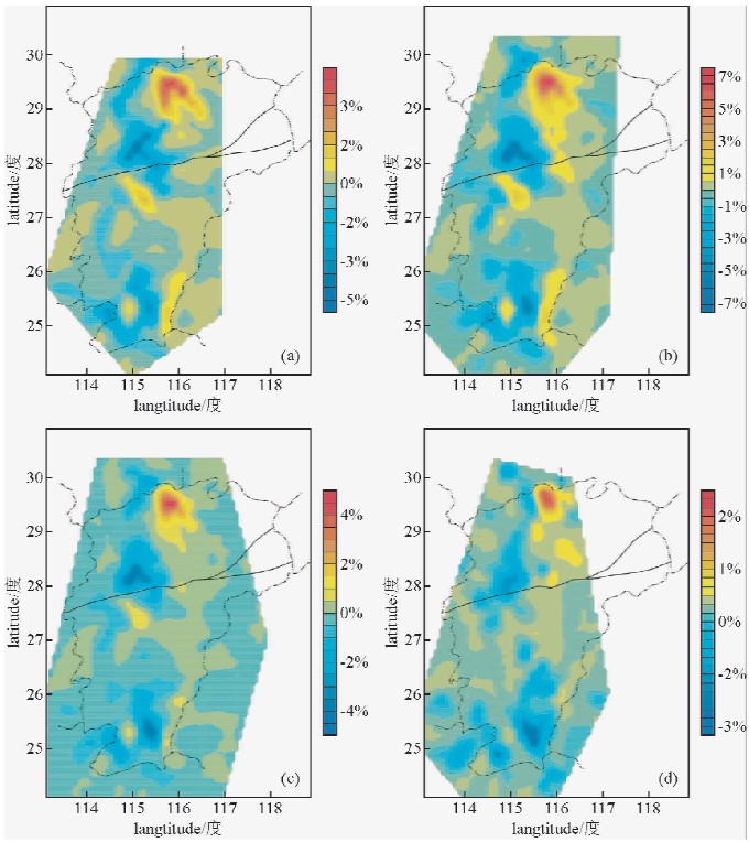 4.1 搜集了区域地质构造资料,近年来江西地震台网(24个台站)监测的江西及邻区的地震事件,经过整理、筛选,确定有完整记录且同时有四台以上记录的地震事件有634次,地震记录2457条,利用阻尼最小二乘法对江西地区上地壳三维速度结构进行成像.从成像结果(图 5、图 6)可以看出: