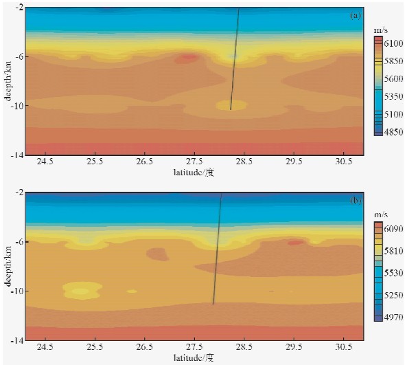 ![]() | 图 6 纵向沿经度切片速度分布图(—缝合带位置)(a)115.0°沿经度切片;(b)115.6°沿经度切片. Fig. 6 Vertical along Longitude slice speed distribution(a)115.0° Vertical along Longitude slice;(b)115.6° Vertical along Longitude slice. |