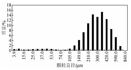 由于绥中36-1和秦皇岛32-6油田的砂岩沉积相以水下分流河道、河口坝、远沙坝及前缘席状砂微相为主(冯增昭,1993;蒋志斌等,2007),储层岩石多属于岩屑长石砂岩,其次为岩屑长石石英砂岩.因此可使用河沙来模拟天然岩心的骨架颗粒,现场天然岩心以中-细砂为主,根据天然岩心粒度分析结果(图 1),制作人造岩心时粒径分布范围及各个不同级别粒径的质量含量,均严格按照这种分布特点进行筛选,其粒径比则按40~60目(40%)、60~100目(50%)、100~200目(10%)三种粒度范围筛选河沙.