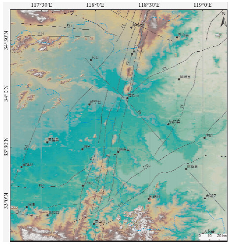 主要断裂分布参考中国活动构造图(邓起东,2007),并根据重力资料进行了修改.F1:山左口-泗洪断裂;F2:新沂-新店断裂;F3:墨河-凌城断裂;F4:纪集-王集断裂;F5:马陵山-重岗山断裂;F6:无锡-宿迁断裂;F7:苍尼断裂; F8:邵店-桑墟断裂;F9:海泗断裂;F10:淮阴-响水口断裂;F11:洪泽-沟墩断裂;F12:铁佛沟断裂;F13:韩庄断裂;F14:利辛-五河断裂;F15:阜阳-固镇坳南缘断裂Fig. 1 Distribution of active fault of the study area Faults are cited from Map of active faults in China(Deng,2007),and amended based on gravity data. |