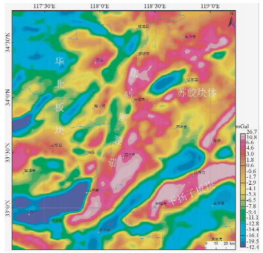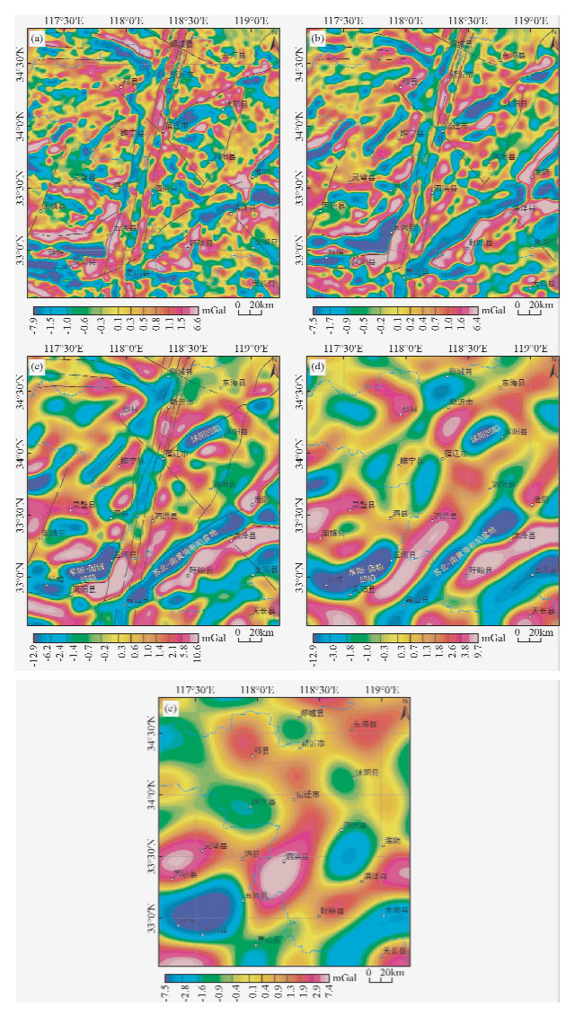 布格重力异常主要反映了区域场源信息.异常图显示,研究区重力异常整体表现为东高西低的特征(图 2),异常值变化幅度较大,在-42.4~26.7 mGal之间.郯庐断裂带纵贯区域中央,沿新沂-宿迁-泗洪-五河一线形成了NNE走向的大型高重力异常条带及重力梯度带,分隔了西侧的华北板块和东侧的苏胶块体、下扬子板块,成为区域内重要的地球物理分界线,断裂带的密度异常明显高于两侧地块.区域东侧由苏胶块体与下扬子板块组成,重力异常整体偏高,两个块体之间被淮阴-响水口断裂隔开;区域西侧为华北板块,重力值明显低于西侧,表现为中低重力异常区.郯庐断裂带两侧出现几个大规模重力低异常圈闭,对应相关的大型沉积凹陷,东南侧的嘉山-淮阴一带形成了NE向大型低异常条带,代表着苏北-南黄海断裂盆地,五河县东侧近东西向的大型低重力圈闭为阜阳-固镇凹陷.