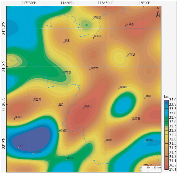 研究区西侧存在两个沉降区,其中北部的沉降区位于邳县以西,该区莫霍面埋深较大,在地貌单元上对应着鲁中南隆起,是重力均衡调配的结果;另一个沉降中心位于蚌埠地区,在地质单元上对应阜阳-固镇凹陷,莫霍面深度可达35 km;灵璧-固镇地区出现莫霍面局部隆起,分隔着南北两侧沉降区,地壳厚度变薄约为30~31 km.区域东侧是苏胶及下扬子地块的沿海平原地带,地壳厚度相对于西侧的华北地区较薄,莫霍面整体埋深较浅,在29~33 km之间变化.