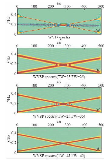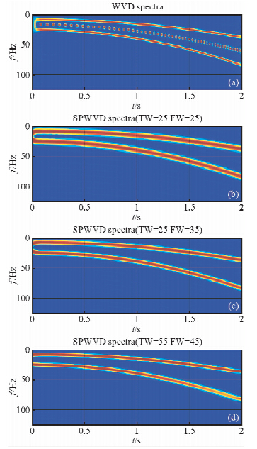 ![]() | 图 2 谱分解结果(a)WVD(b)SPWVD,其中时间和频率窗函数大小为25,25(c)SPWVD,其中时间和频率窗函数大小为25,35(d)SPWVD,其中时间和频率窗函数大小为45,45.SPWVD结果很大程度依赖于窗函数大小Fig. 2 The spectral decomposition results obtained with(a)WVD(b)SPWVD(the time and frequency windows are 25 and 25)(c)SPWVD(the time and frequency windows are 25 and 35(d)SPWVD(the time and frequency windows are 45 and 45). Note that the results of SPWVD are heavily depended on the size of windows |