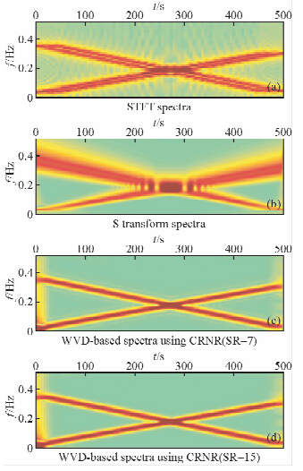 尽管WVD表达式在数学上为实函数,利用CRNR迭代计算的Wd(n,k)却为复数.因此,我们将随时间变化的Wd(n,k)的绝对值(模)定义为WVD时频分布.值得注意的是,整形算子的长度可控制谱分解的收敛速度和时频分辨率.